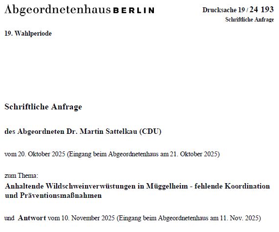 Drucksache S19-24193 Schriftliche Anfrage und Antworten Anhaltende Wildschweinverwüstungen in Müggelheim - fehlende Koordinierung und Präventionsmaßnahmen