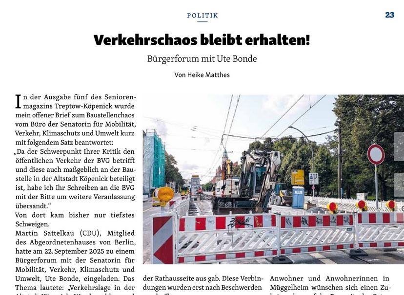 Verkehrschaos bleibt erhalten! Bürgerforum mit Ute Bonde Quelle Seniorenmagazin TK 06/2025
