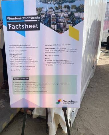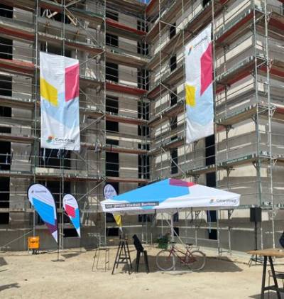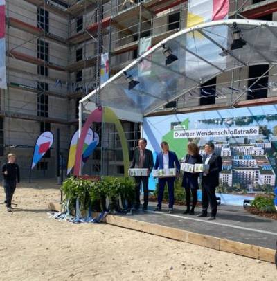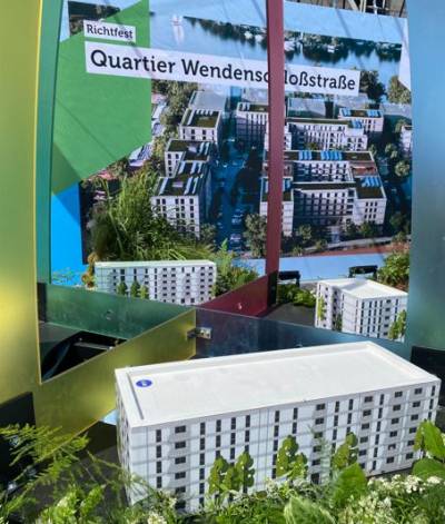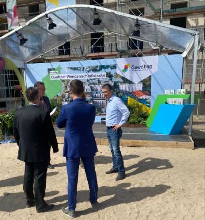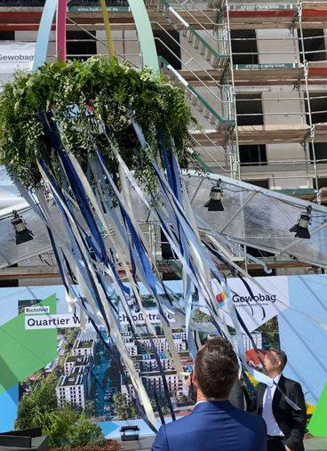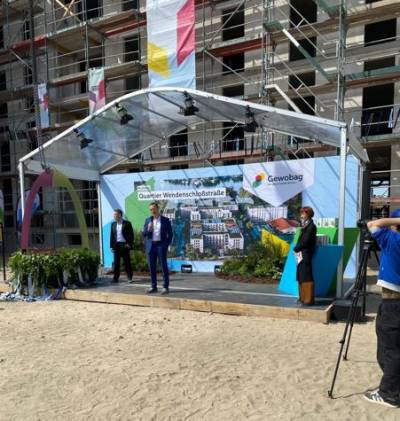 Am 08. Mai 2024 fand das Richtfest der „Gewobag“ auf der Baustelle des Quartiers Wendenschloßstraße statt. Die Vorstände der „Gewobag“, Markus Terboven und Malte Bädelt eröffneten das Richtfest mit Ihren Reden von der Bühne.