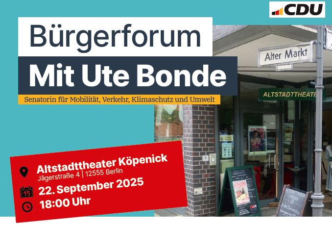 Am 22. September 2025 um 18 Uhr lädt die Senatorin für Mobilität, Verkehr, Klimaschutz und Umwelt, Ute Bonde, gemeinsam mit dem Abgeordneten Martin Sattelkau ins Altstadttheater Köpenick ein.