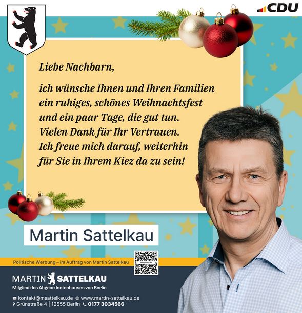 Liebe Nachbarn, ich wünsche Ihnen und Ihren Familien ein ruhiges, schönes Weihnachtsfest und ein paar Tage, die gut tun. Vielen Dank für Ihr Vertrauen. Ich freue mich darauf, weiterhin für Sie in Ihrem Kiez da zu sein! Ihr Martin Sattelkau