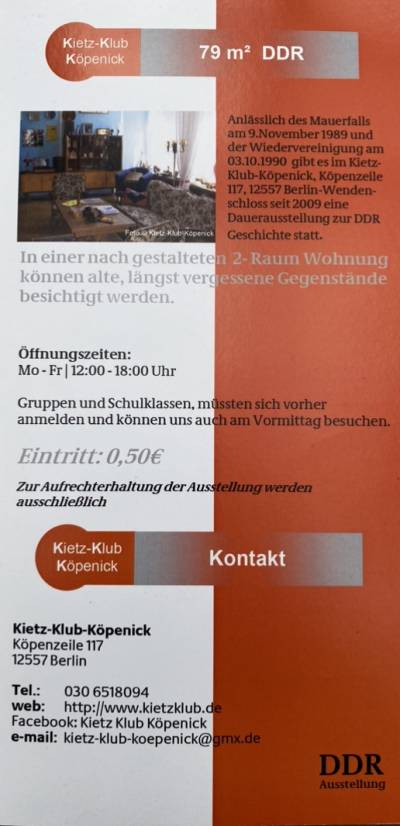 Im Kietz-Klub-Köpenick, in der Köpenzeile 117 gibt es eine ständige Ausstellung zu den Lebensbedingungen in der DDR. In einer nachgestalteten 2-Raum Wohnung können alte längst vergessene Alltagsgegenstände aus der DDR Zeit besichtigt werden.