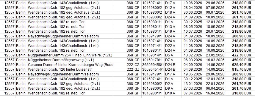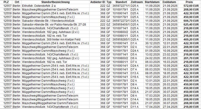 Zeitraum und Ort der Verbreitung: Die Plakatwerbung wird an 4 Standorten in Köpenick von Berlin im Zeitraum vom 1. November bis 31. Dezember 2025 geschaltet. Jedes Motiv wird etwa 10 bis 11 Tage sichtbar sein. Die Schaltungen erfolgen in mehreren Wellen, siehe Tabelle unten.