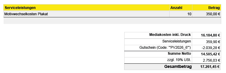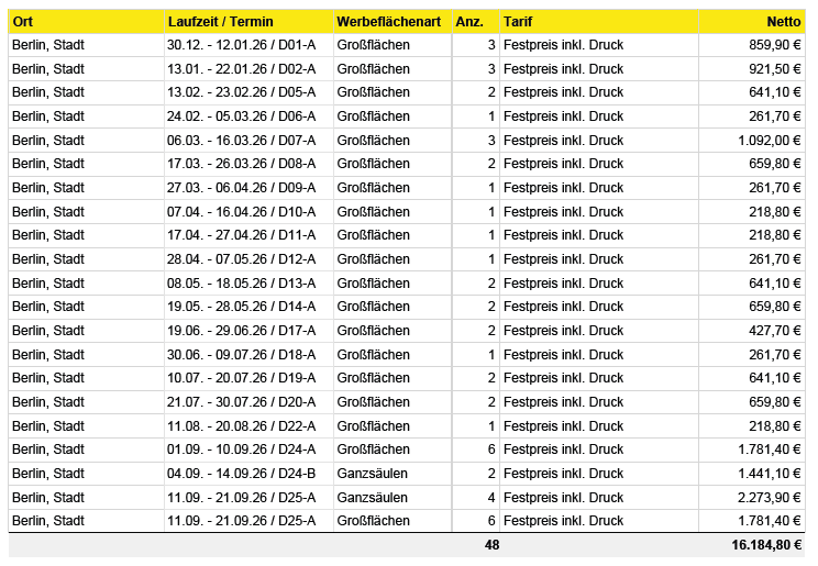 Zeitraum und Ort der Verbreitung: Die Plakatwerbung wird an 12 Standorten in Köpenick von Berlin im Zeitraum vom 1. Januar bis 21. September 2026 geschaltet. Jedes Motiv wird etwa 10 bis 11 Tage sichtbar sein. Die Schaltungen erfolgen in mehreren Wellen, siehe Tabelle unten.