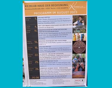 Außerdem bin ich von der Vielfalt des Angebotes im KIEZKLUB Haus der Begegnung sehr beeindruckt. Von Spielenachmittagen, Diskussionsrunden und Musikabenden über Vorträge und Konzerte zu Vernissagen und Ausstellungen, für jeden ist etwas dabei. Ferner bietet der KIEZCLUB ein umfangreiches Kursprogramm an, wie Handarbeiten, Yoga, Tai-Chi, Gedächtnistraining, Kreatives Gestalten, Keramik und vieles, vieles mehr. Es lohnt sich auf jeden Fall einmal reinzuschauen.