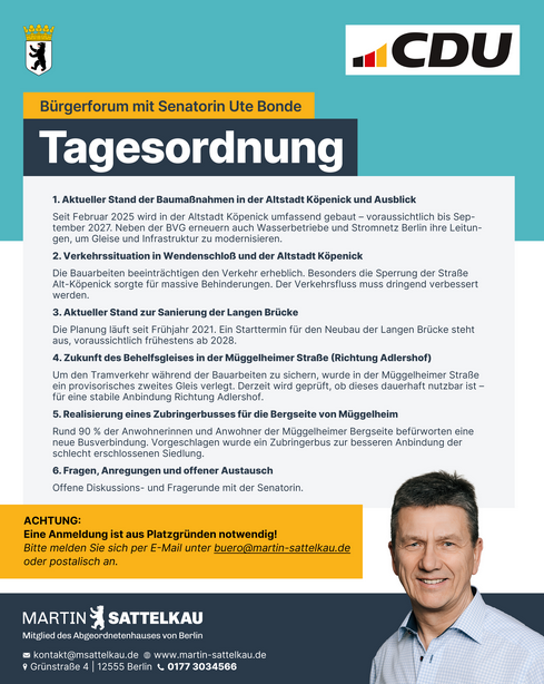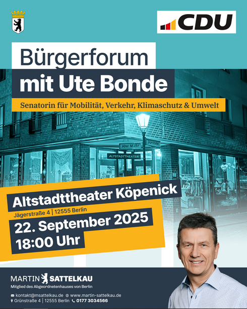Am 22. September 2025 um 18 Uhr lädt die Senatorin für Mobilität, Verkehr, Klimaschutz und Umwelt, Ute Bonde, gemeinsam mit dem Abgeordneten Martin Sattelkau ins Altstadttheater Köpenick ein.